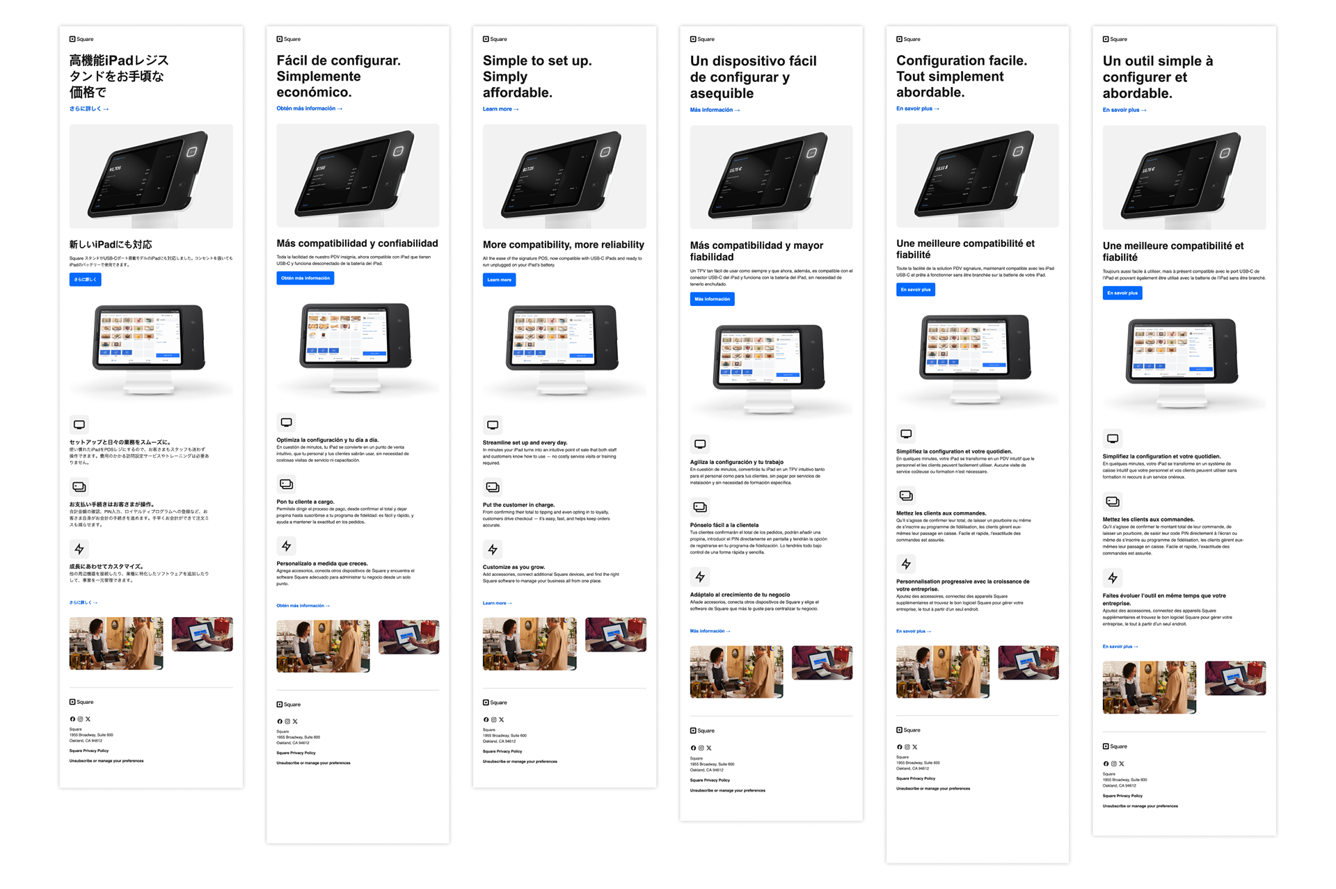 Shipped product pages and digital marketing assets across eight international markets and in eleven languages for the Square Stand (2nd generation) hardware launch